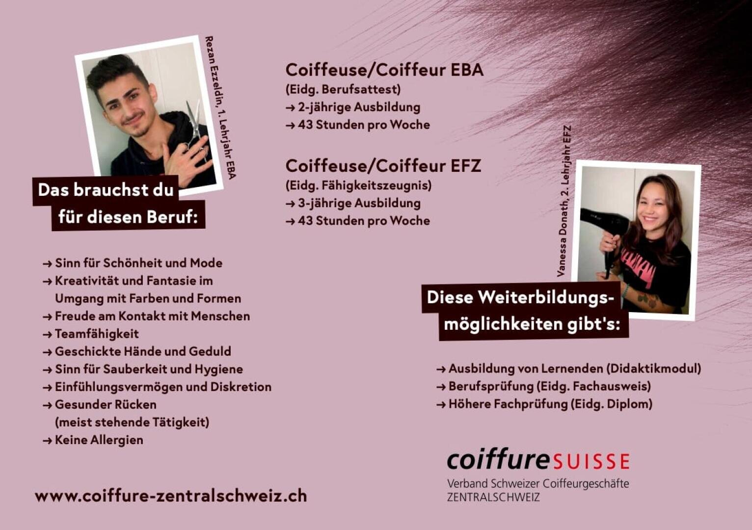 Für deine Zukunft als Coiffeur/Coiffeuse EFZ (Eidg. Fähigkeitszeugnis) oder Coiffeur/Coiffeuse EBA (Eidg. Berufsattest), helfen dir die nachfolgenden Informationen.
