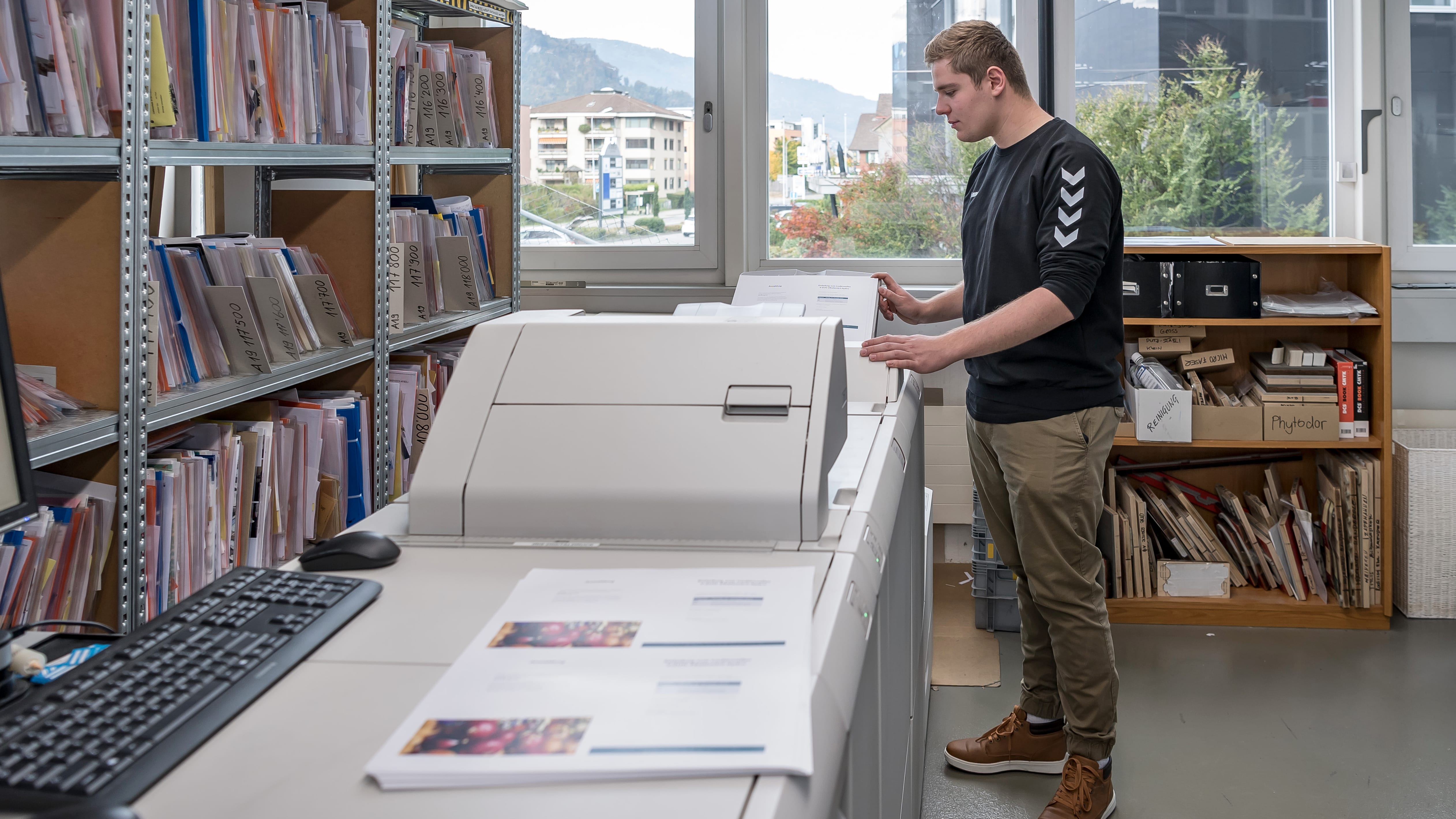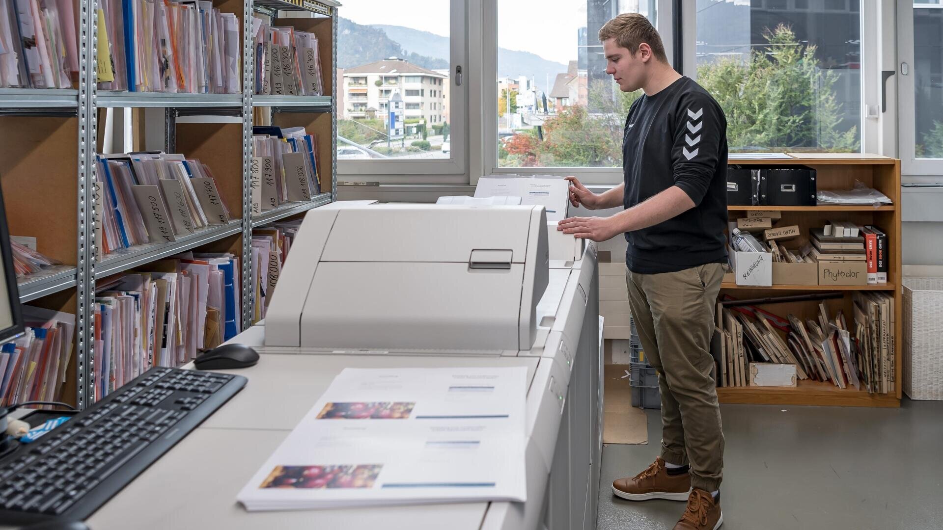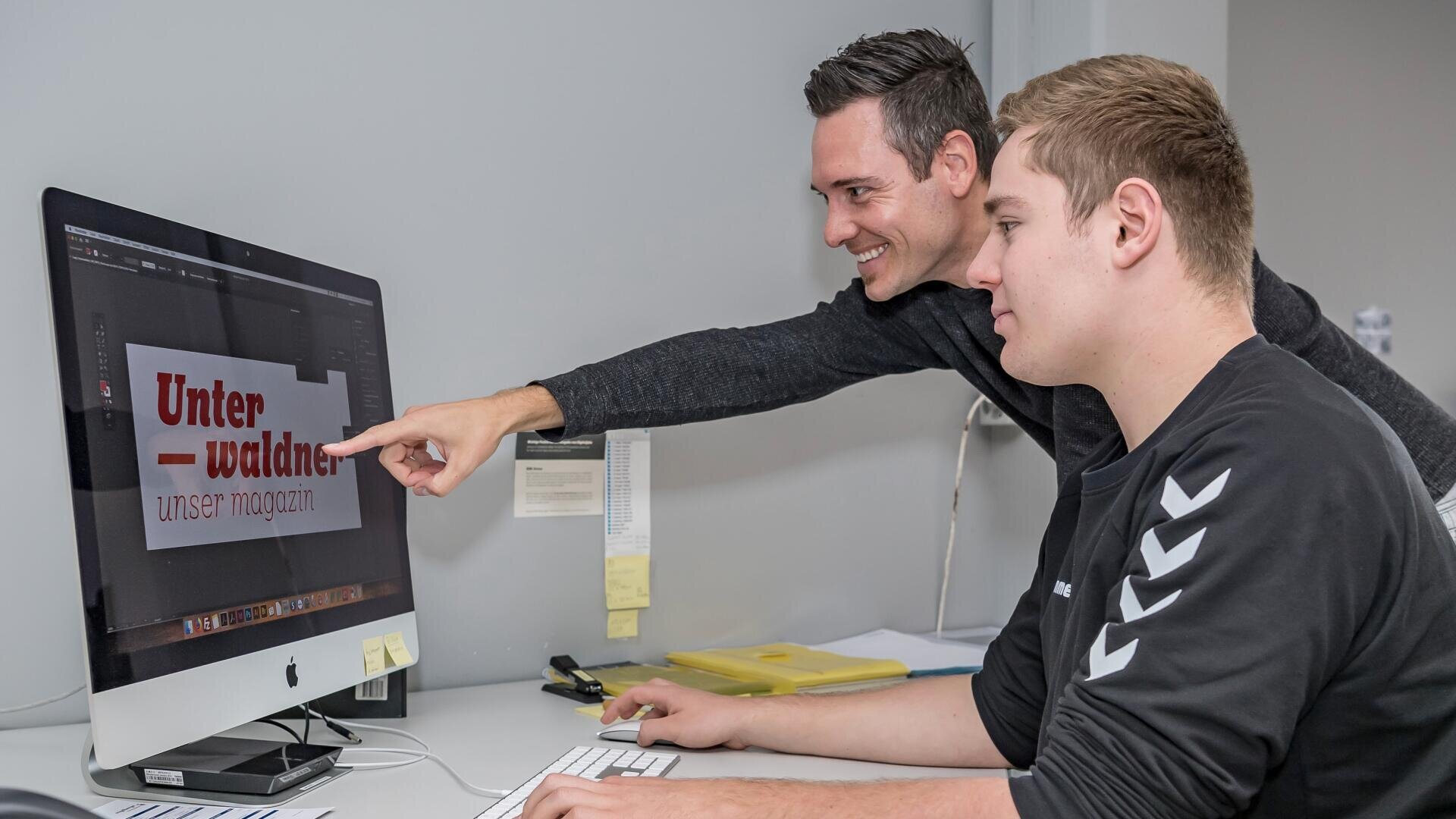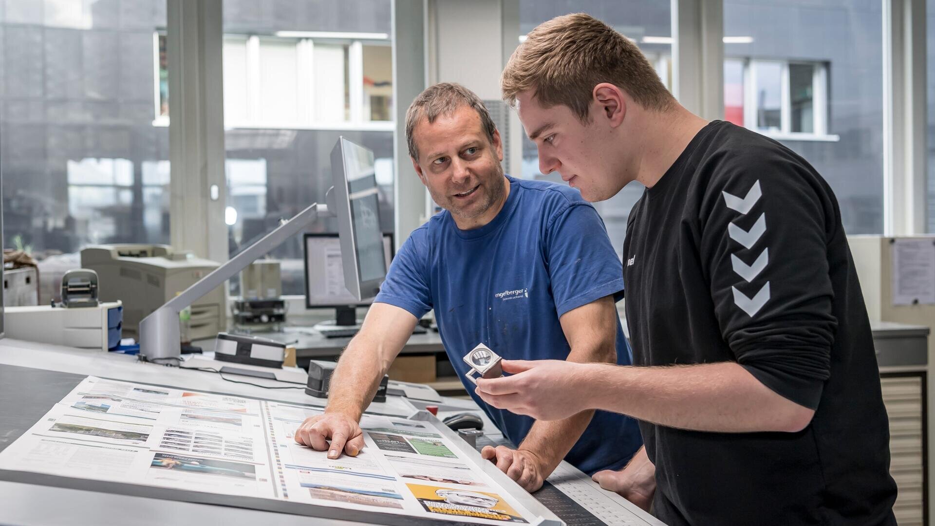 Inzwischen hat André zwei Seiten des «Unterwaldner» fertig und bespricht sie mit Medienvorstufenleiter und Ausbildner Simon Waser. Dieser ist zufrieden, es gibt nur noch Kleinigkeiten zu bereinigen. Dann geht es kurz eine Etage tiefer, in die Druckerei: Neben der Offsetmaschine steht eine Palette mit druckfrisch duftenden Bogen für eine Hochglanz-Broschüre. Mit dem Drucktechnologen Patrick Schuler schaut André sich die Brillanz und die Farbwiedergabe auf dem hochwertigen Papier an und freut sich über das Resultat.