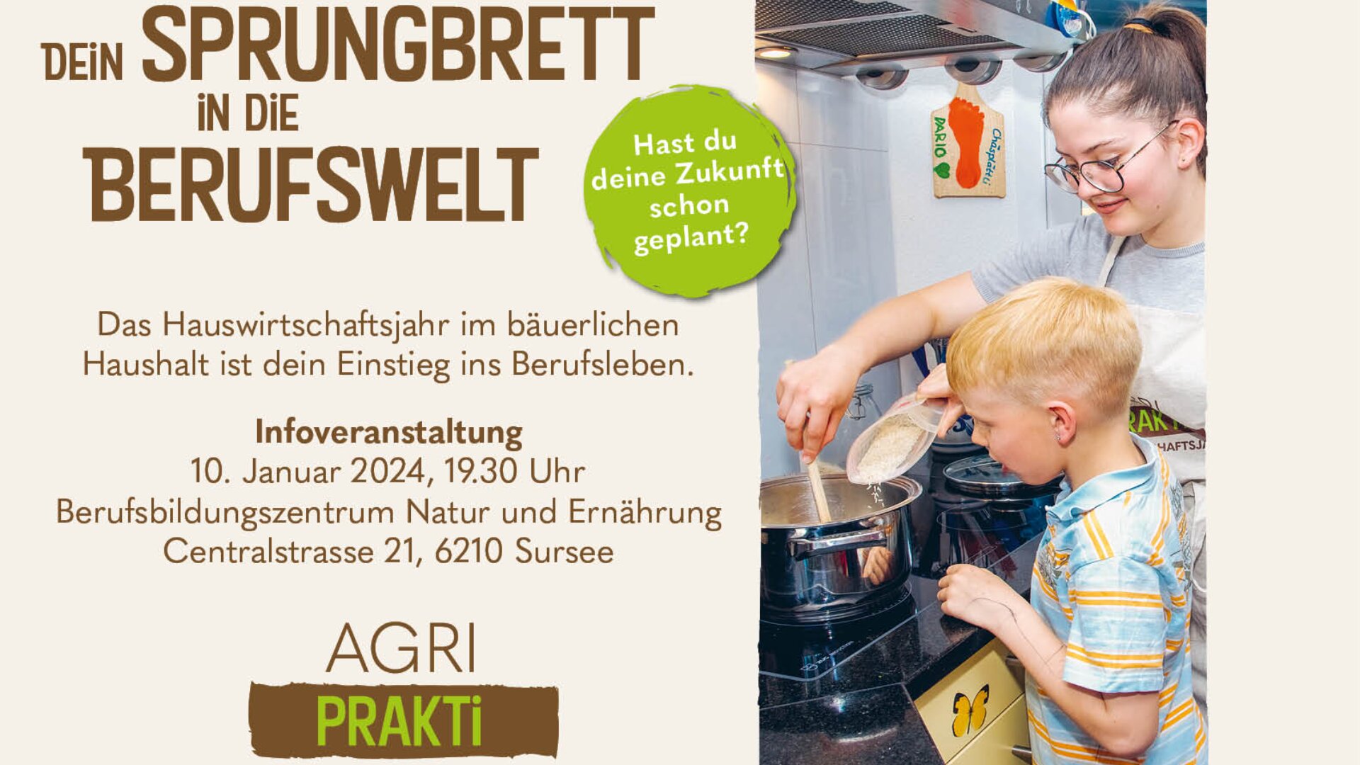 agriPrakti lädt am 10. Januar 2024 um 19.30 Uhr zur Informationsveransaltung rund um das sinnvolle Zwischenjahr ein. Die Veranstaltung findet im BBZN Sursee (Sousol) statt. Wir freuen uns auf Dich!